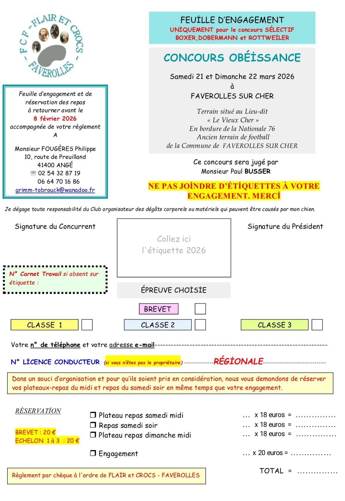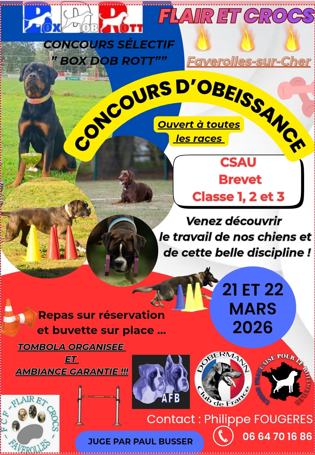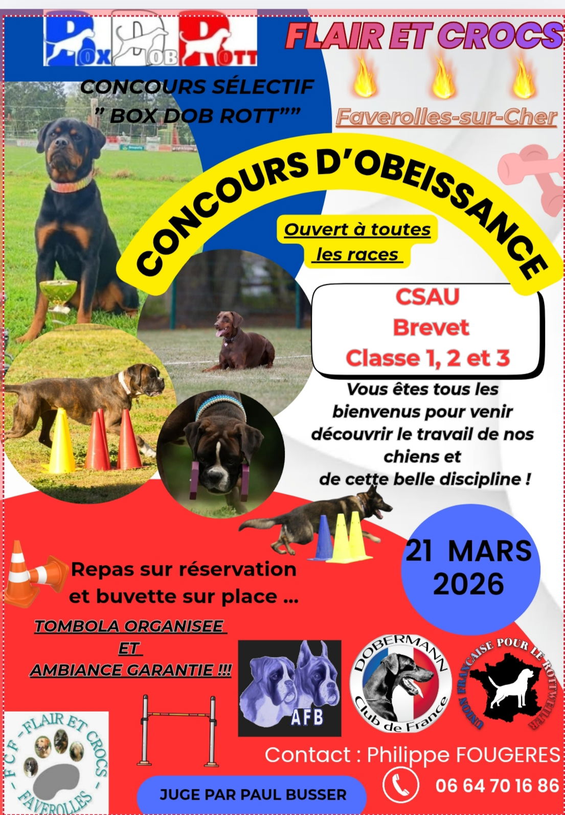 En savoir plusQU’EST-CE QUE LE TRAVAİL PRATİQUE EN CAMPAGNE ? C’est une discipline de la Cynophilie Française qui, au travers d’exercices sur des parcours toujours différents (cadre naturel tel que parc public, plan d’eau, bois etc…), met en avant toutes les qualités requises d’un chien d’utilité : le flair, la garde, les sauts, le travail à l’eau, l’obéissance, la sociabilité. Les chiens font preuve non seulement de leur courage mais aussi de leur résistance physique. Les sites étant chaque fois différents l’esprit d’initiative est indispensable. Encore méconnu du grand public, le Campagne est certainement la discipline la plus complète du sport canin. L’organisation de telles épreuves nécessite beaucoup d’espace. c’est pourquoi le club a organisé des concours au Plan d’Eau de MONTHOU SUR CHER, dans le village de FAVEROLLES SUR CHER et au Plan d’Eau de MONTRICHARD chaque année au mois de mars ou mai. Le cadre doit présenter des obstacles naturels et des situations imprévisibles, voire insolites. Le travail est varié, ce qui est parfait pour les chiens rebelles à la mécanisation qui pourront exprimer là leur sens de l’initiative ! La plus grande difficulté est de parvenir à maintenir le chien au plus haut niveau de concentration. Les exercices se succèdent en effet sans discontinuer, à un rythme soutenu. L’animal doit systématiquement oublier le précédent pour se consacrer au suivant. LES EXERCİCES Obéissance : Refus d’appâts : qu’ils soient placés sur le parcours ou bien lancés, le chien ne doit ni lécher ni manger – Suite en laisse et sans laisse : le chien doit suivre au pied son maître qui effectue des changements de direction – Enchaînement de positions imposées et commandées à distance : assis, couché, debout que le chien doit exécuter. Franchissement d’obstacles : comme dans d’autres sports canins, le chien doit sauter mur (de 1,80 à 2 m), rivière ou fossé (de 3,50 m à 4 m), haie (1,20 m), grillage (1 m) derrière lesquels peut avoir lieu un exercice de mordant (sauf derrière le mur) tel que face ou garde au ferme avec ou non des artifices (panier, branchage, arrosoir, etc…) que l’Homme Assistant tient en main afin de faire un barrage au chien. Protection et défense du maître démuselé : un Homme Assistant doit simuler une agression sur le maître. Le chien doit alors défendre spontanément sans recevoir de commandement et cesser de mordre sur ordre de son maître. Protection et défense du maître muselé : tout comme la défense du maître démuselé le chien équipé d’une muselière de frappe doit défendre son maître spontanément en venant frapper l’agresseur et doit cesser immédiatement sur ordre du maître. Recherche-Découverte et Accompagnement : au terme d’un parcours précis, l’Homme Assistant doit se cacher. Le chien dispose d’un laps de temps très précis pour le retrouver et prévenir son maître en aboyant. l’Homme Assistant doit fuir à plusieurs reprises : le chien doit alors mordre pour le stopper et cesser sur ordre de son maître. Garde d’objet : le conducteur confie à son chien la garde d’un objet. Le chien doit empêcher l’Homme Assistant de prendre cet objet par une action de mordant d’une durée maximum de cinq secondes avant de retourner d’initiative à son objet pour le garder. Les objets utilisés peuvent être une poussette d’enfant, une tondeuse, un sac, un vélo etc…. Travail à l’eau : un objet flottant est lancé dans l’eau à la vue du chien qui doit sauter et le rapporter en lui remettant assis. Un autre objet est lancé à l’insu du chien qui doit le retrouver et le rapporter. Un troisième exercice consiste à envoyer le chien dans l’eau en lui disant « en avant ». Il doit nager et ne revenir qu’au coup de sifflet donné par son maître. Pistage : deux sortes de pistes doivent être effectuées par le chien. La première piste dite en libre, le chien est lancé sur une piste avec plusieurs angles droits et aigus, le chien doit rapporter à son maître un objet de 12 cm de longueur. La seconde piste dite au trait est effectuée avec le maître. Le chien est équipé d’un harnais auquel est attaché une longe de 10 mètres. Le chien devra refaire la piste effectuée par le traceur en rapportant à son maitre les objets déposés sur la piste. Au bout de la piste le chien devra identifier le traceur, se fixer devant lui et aboyer. Homme Assistant : personne qui porte le « costume » en toile de jute épaisse pour faire mordre les chiens LORS DE CES CONCOURS VOUS AVEZ LA POSSİBİLİTÉ DE VOUS JOİNDRE AU GROUPE DERRİÈRE LE CHİEN QUİ TRAVAİLLE TOUT EN RESPECTANT LES CONSİGNES DE SÉCURİTÉ .